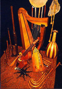 "EARLY INSTRUMENT SPLENDOR" Left, a selection of historic instruments from our Renaissance & Medieval collection: starting in lower right-hand corner, ccw SATB Crumhorns, Hurdy Gurdy, assorted whistles (Catalan, Provencal, English), Lute, Breton French bagpipe "veuze," Medieval frame drum, Celtic harp, a rack of assorted historic reeds (SAT shawms, Breton bombard), rebec (Medieval fiddle), viol da gamba, gemshorn For a close-up look at these and other very rare instruments in our collection, visit our "Bells & Motley Instrumentarium" webpage! |